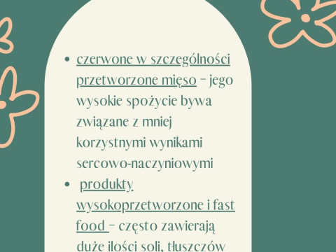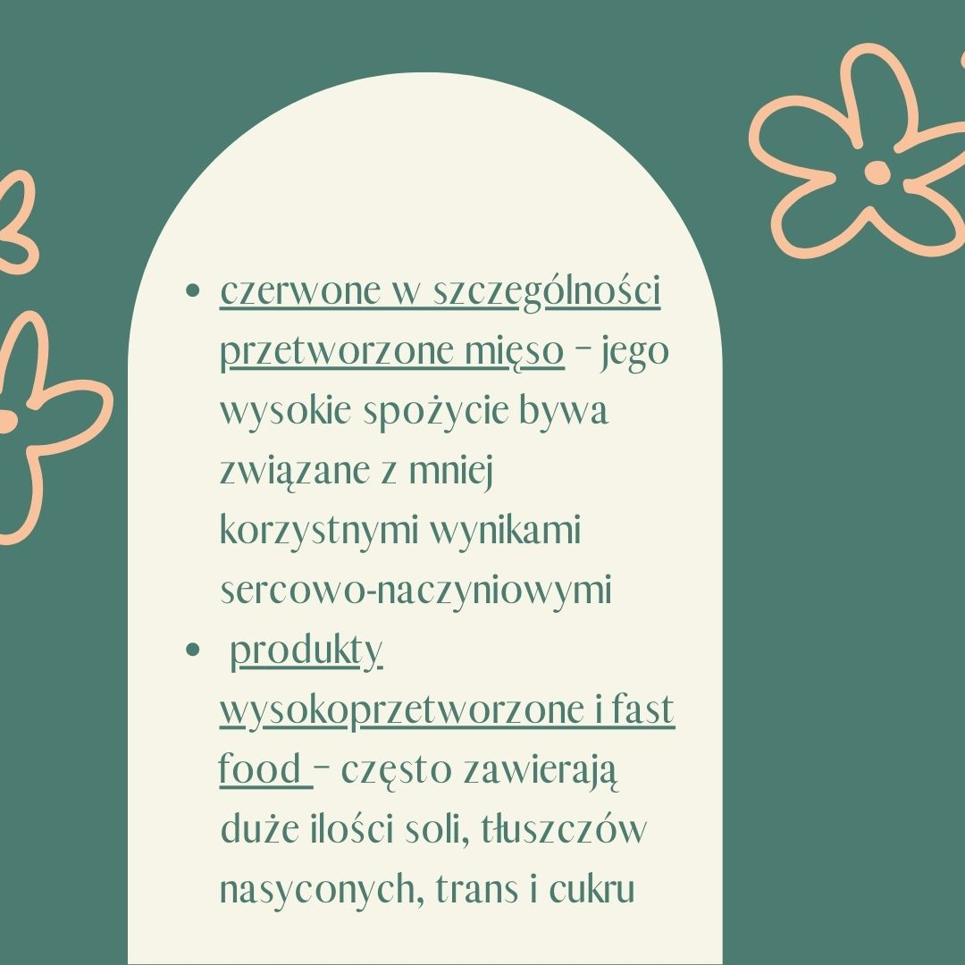 czerwone w szczególności przetworzone mięso – jego wysokie spożycie bywa związane z mniej korzystnymi wynikami sercowo-naczyniowymi