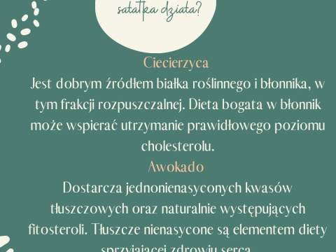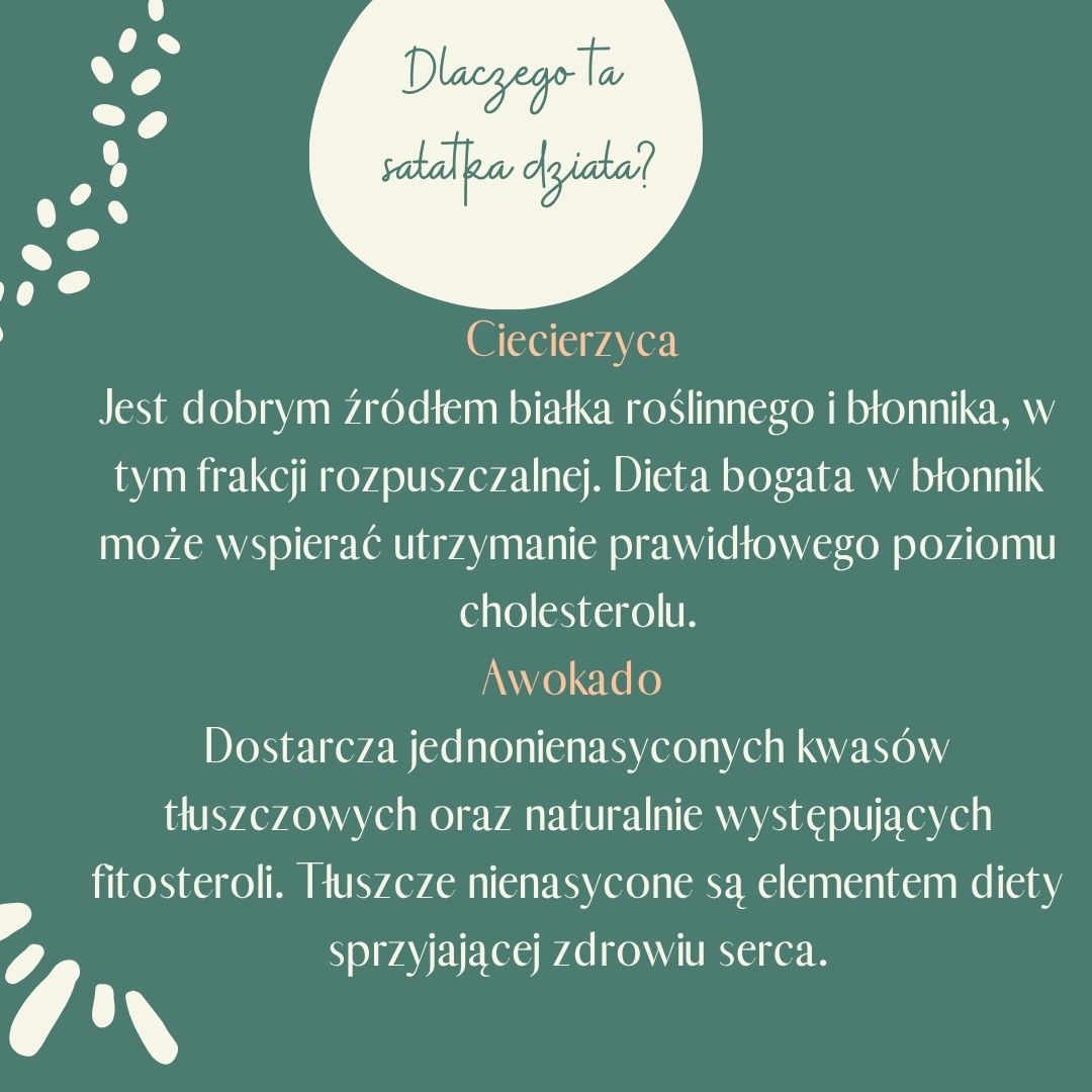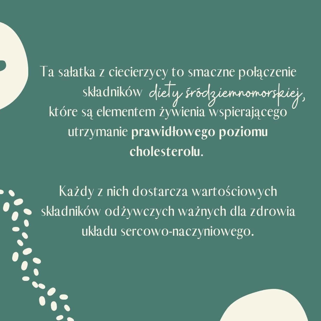 Ta sałatka z ciecierzycy to smaczne połączenie składników diety śródziemnomorskiej, które są elementem żywienia wspierającego utrzymanie prawidłowego poziomu cholesterolu. Każdy z nich dostarcza wartościowych składników odżywczych ważnych dla zdrowia układu sercowo-naczyniowego.