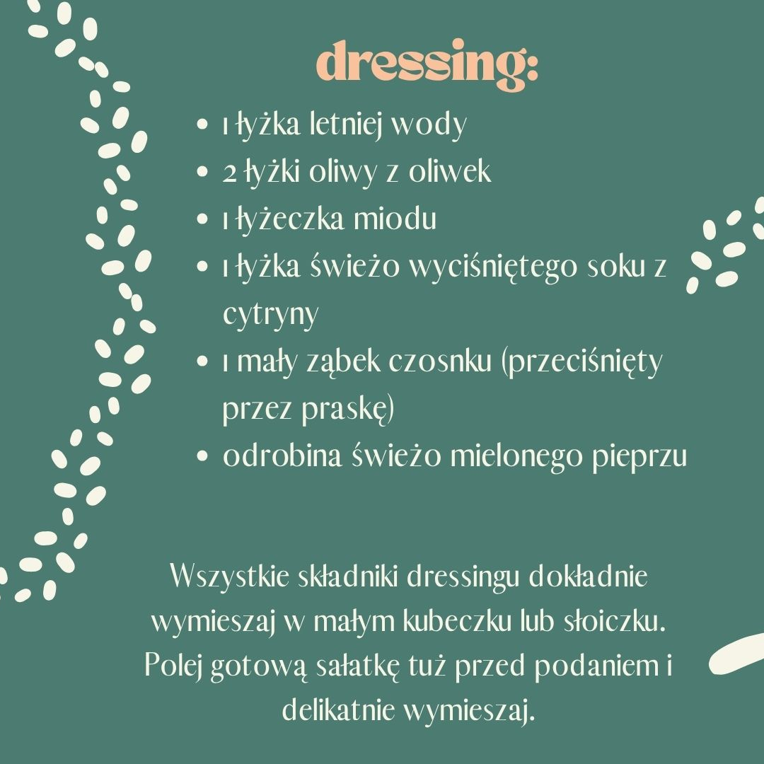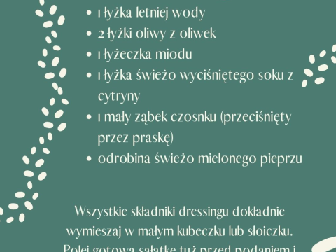 Wszystkie składniki dressingu dokładnie wymieszaj w małym kubeczku lub słoiczku. Polej gotową sałatkę tuż przed podaniem i delikatnie wymieszaj.